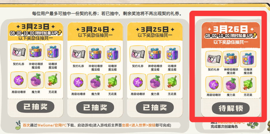 继续提一嘴,Wegame/pc启动器的玩家别忘了,明天把3月26号的抽了。