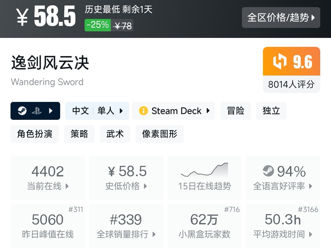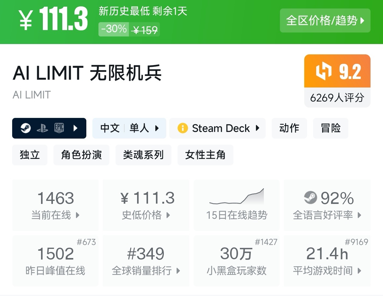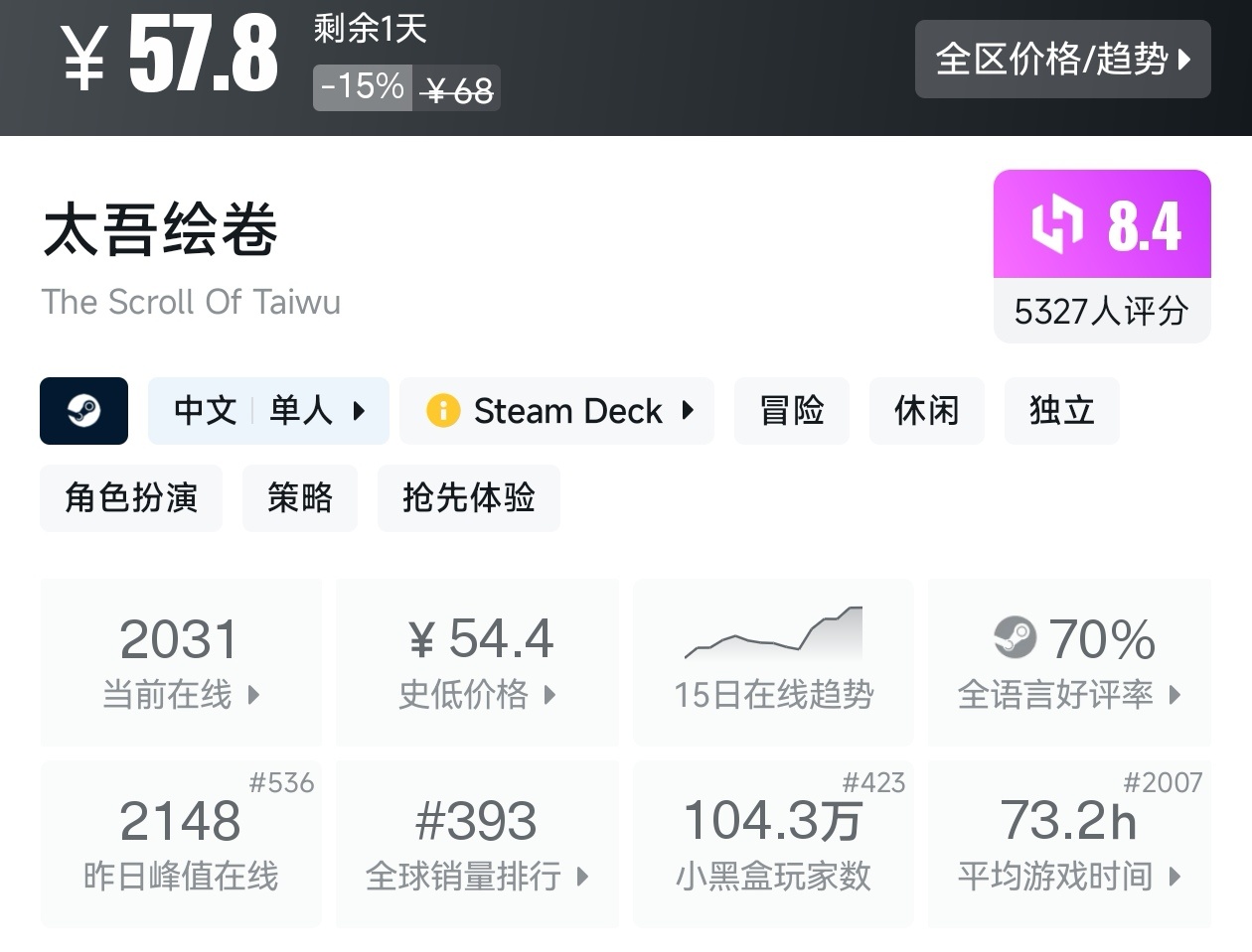 大家好,在最近,这不是已经春促,虽然明天就结束,当然,这期帖子,如你所见,是一期关于国产游戏的折扣汇总,有很多精品国产游戏在最近几年陆续发售,再次证明并不是国人做不出好的单机游戏,只要有肯大力发展,就能崛起,所以说现在大厂都在做单机游戏,我将为各位进行一个汇总,希望我的汇总,能够帮助各位盒友挑选心仪的游戏。