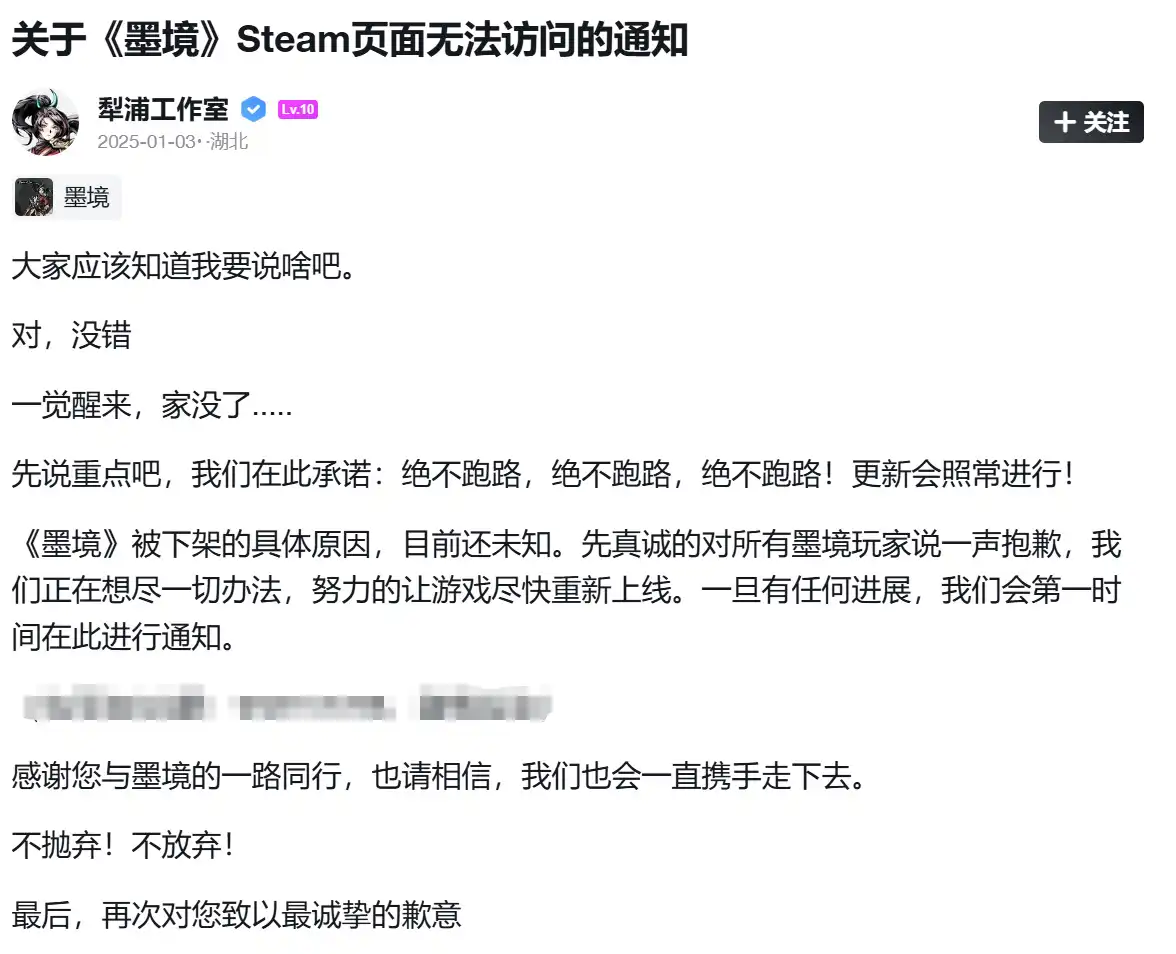 从2024年9月上线Steam,开启EA测试至今,《墨境》并非一帆风顺。2025年1月,由于发行商的缘故,《墨境》惨遭下架。