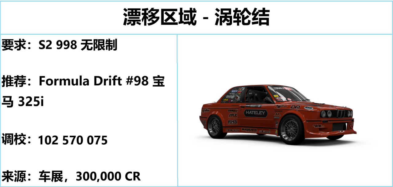 小马力的 FD 宝马 325i,建议是关闭大部分辅助+锁定二档,进入区间后小幅度摆动实现侧滑。