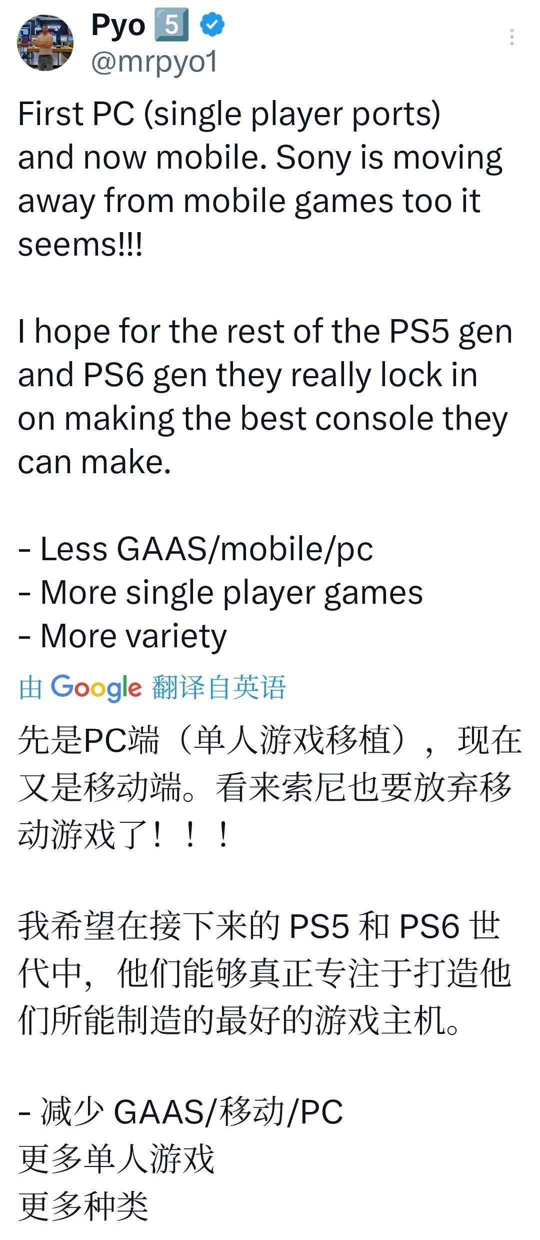 知名游戏博主@mrpyo1的评论基本符合玩家圈主流声音:呼吁索尼减少直播服务游戏、手游及泛PC移植项目,转而专注主机核心业务。这与索尼近年战略摇摆有关——PS5早期喊出“12款GAAS”目标,后来多款取消或延期,市场反馈也一般。