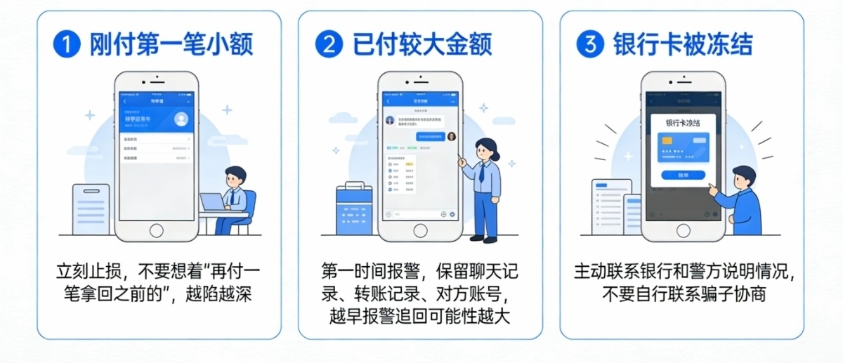 如果已經付了較大金額,第一時間報警。保留聊天記錄、轉賬記錄、對方賬號。越早報警,追回錢的可能性越大。別自己聯繫騙子“協商”,對方只會繼續騙你。