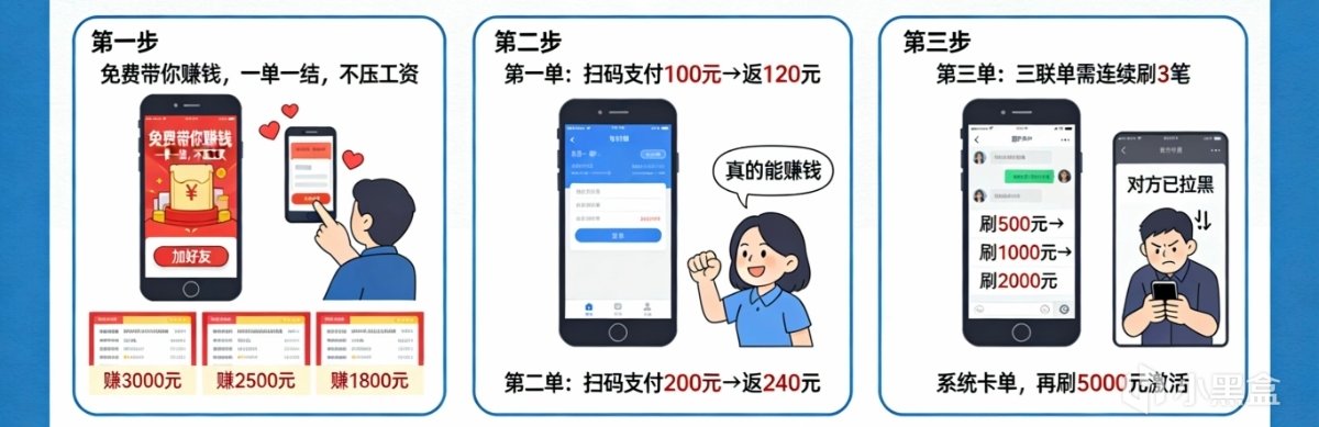 發廣告:“免費帶你賺錢,一單一結,不壓工資”。配幾張收款截圖,有人賺了幾千塊。你看了心動,加了聯繫方式。