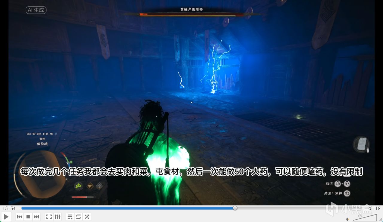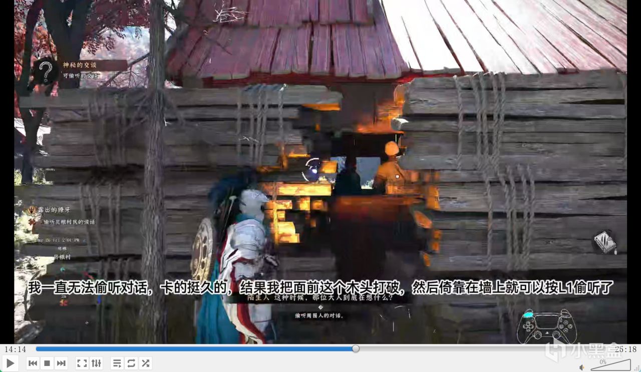 这个区域的精英怪很 BT,我站那么高莫名其妙被打到,一下就秒了,特别无语。后面有提示可以偷听对话获取关键情报推进主线,却漏了关键点,没说要先按 L3 靠在墙上,我一直没法偷听,卡了挺久,结果打破木头倚靠在墙上,按 L1 就能偷听了,游戏的提示只说一半,很容易让玩家卡关,这是我真的无法忍受的设计缺陷。