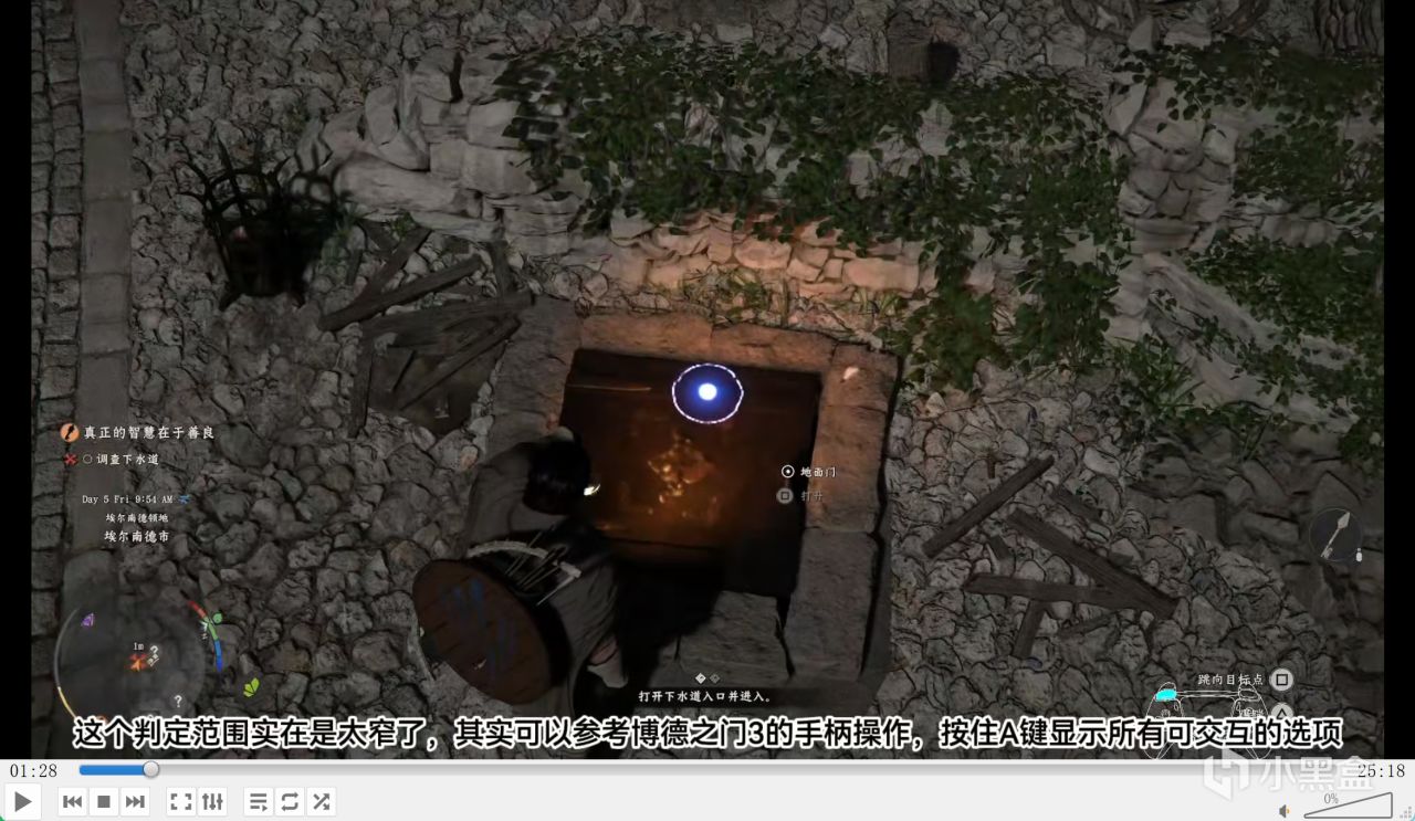 来到新手村后,剧情变得很奇怪,先是摆手腕的新手教学,然后去下水道救人。这里我卡了好久,以为需要下水道钥匙,结果交互判定范围极窄,必须在合适时机、合适地点才能触发,交互设计太拉胯。建议参考《博德之门 3》的手柄操作,按住 A 键显示所有可交互选项,手柄一定要用带背键的,不然键位根本按不过来。