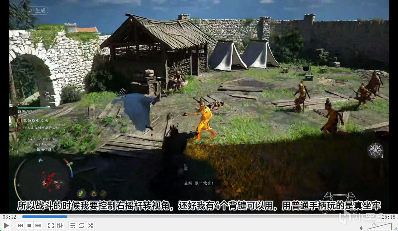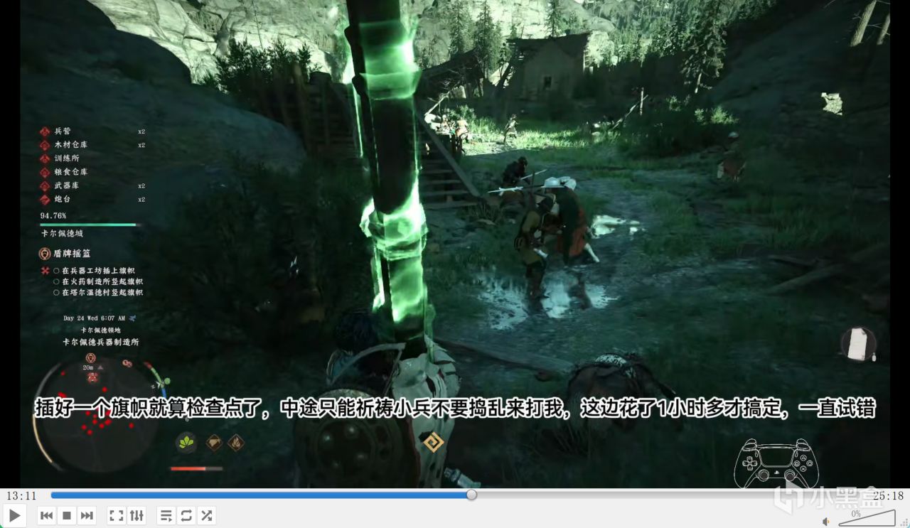 小兵还把上楼梯的路卡住,根本进不去,恒温加高血压拉满,好不容易从 40 米远的地方搬过来,就差一点触发检查点,结果又死了。旗帜被打丢后,小地图还不显示,要盯着敌人攻击在战场找,特别折磨。有提示的地方永远只有几排解释,还漏掉关键点,比如不知道怎么触发支援炮台射击,搞半天是要用弓箭射击,游戏里就不能写按住 L2 放箭会触发吗?引导性太弱了。