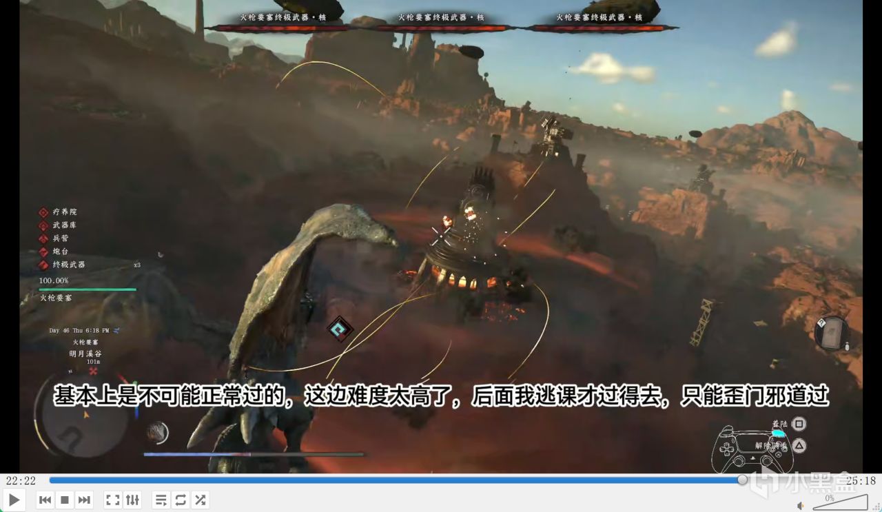 后面还要骑龙破坏 3 个要塞,气得我半夜怒吼。这边炮塔厉害,龙难操控还有空气墙,打着打着会被卡住,有玩家卡了 10 小时才过。本来以为骑龙是爽游,结果更坐牢,正反馈变究极折磨,负反馈给我气死了。这里没有检查点,要一口气打完所有炮塔,是整个游戏最恶心、最让我破防的地方,操控 “小儿麻痹症” 的龙完成高难度操作,根本不可能正常过,只能逃课找掩体卡地形,找 3 个点位花半小时才过。