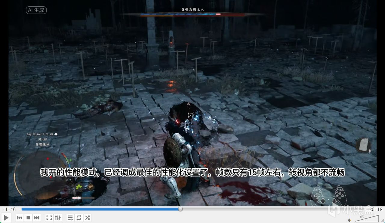 最破防的地方来了,PS5 Pro 这里直接卡爆了,一堆杂兵加 boss 狂放乌鸦特效,估计 CPU 扛不住了。我开性能模式,调成最佳性能化设置,帧数只有 15 帧左右,转视角都不流畅,就像首发《赛博朋克 2077》在 PS4 上的表现,简直是 U 级折磨的帧数,我当时真的崩溃了。