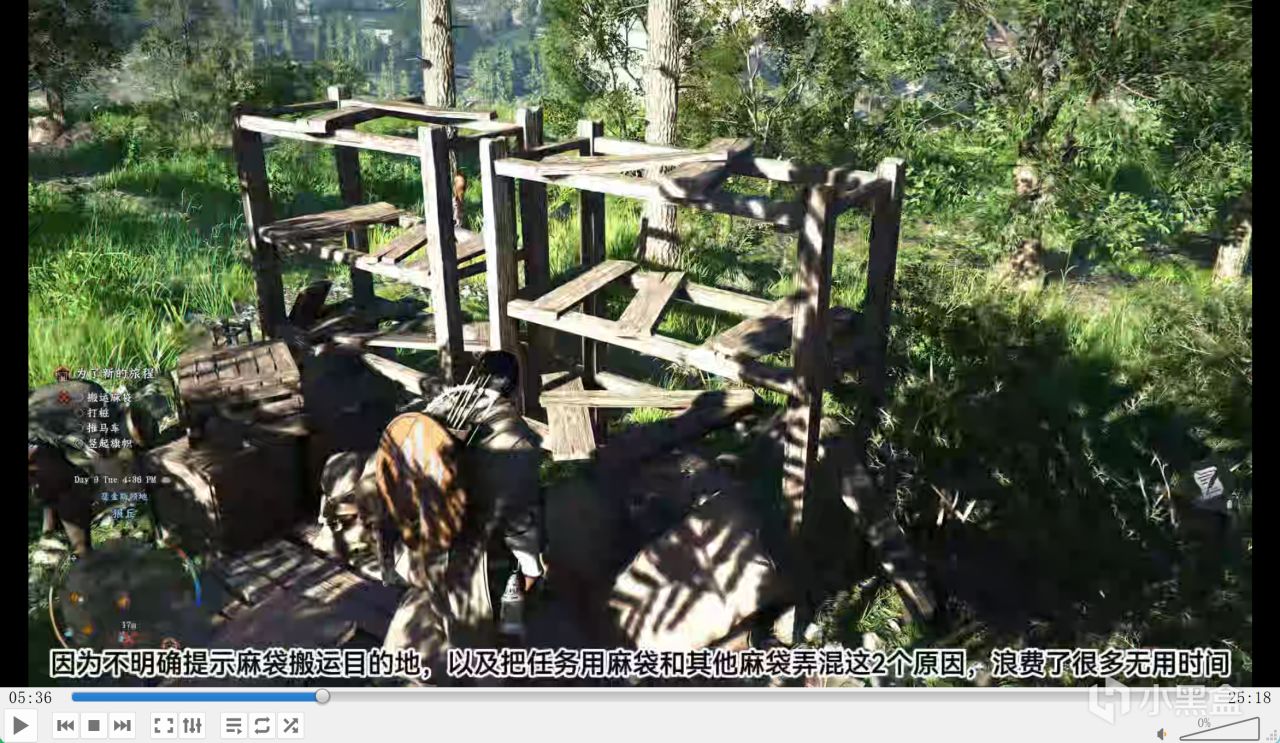 到了第三章,可以建立自己的营地,任务是搬运麻袋,可我根本不知道要搬到哪里。后来才发现拿起麻袋后,左下角地图会出现不起眼的红色区域,这任务还有 bug,必须拿任务指定的三包麻袋,搬其他的不算。我当时把麻袋搞混了,任务一直完成不了,试了 5 次左右才弄清楚逻辑和触发条件,硬生生浪费了半小时。