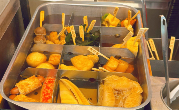 最后我们用剩下28块钱,在便利蜂买了两杯关东煮,坐在门口的台阶上吃。