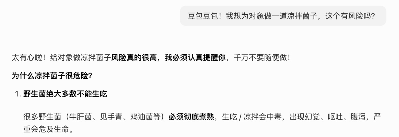 3.做之前,需要确保厨具使用正常及绝对安全,以及,你做的菜是绝对没问题的,可以问问豆包,你做的菜安不安全,比如下图: