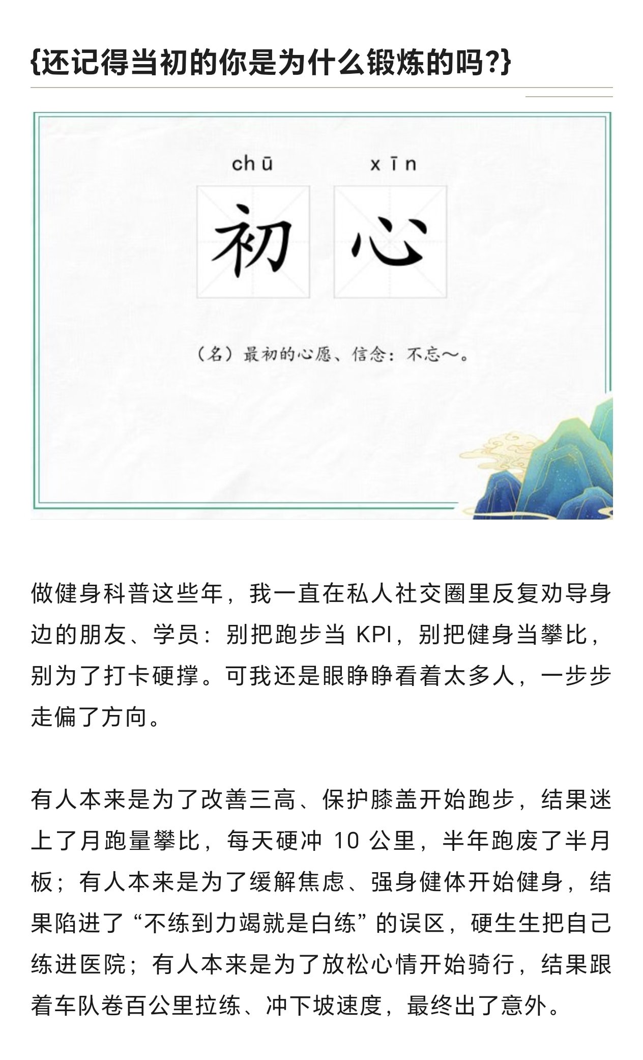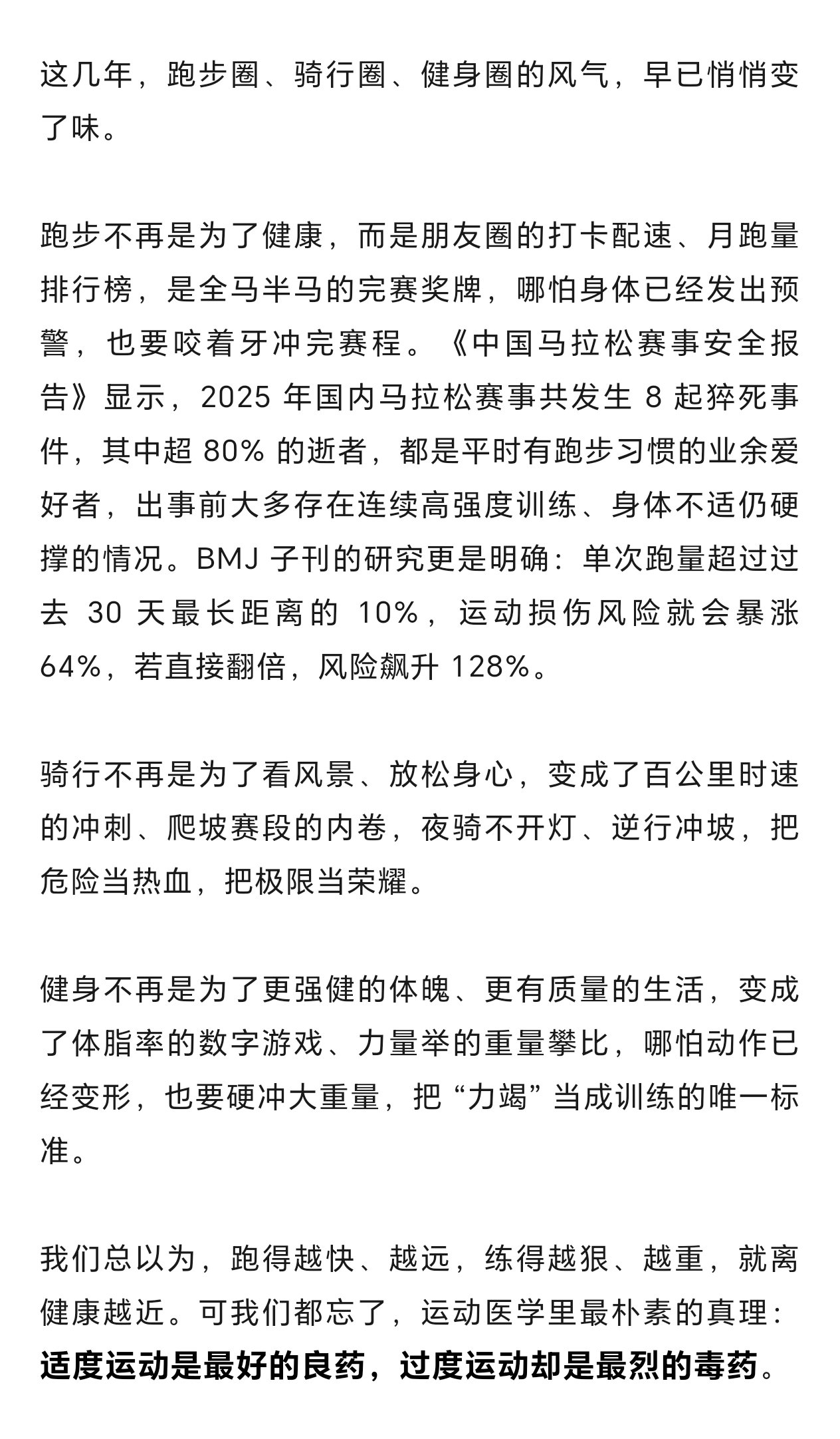 別再爲了打卡硬撐着跑完剩下的公里數,別再爲了攀比硬衝自己扛不住的重量,別再爲了所謂的 “突破自我”,無視身體發出的每一次預警。