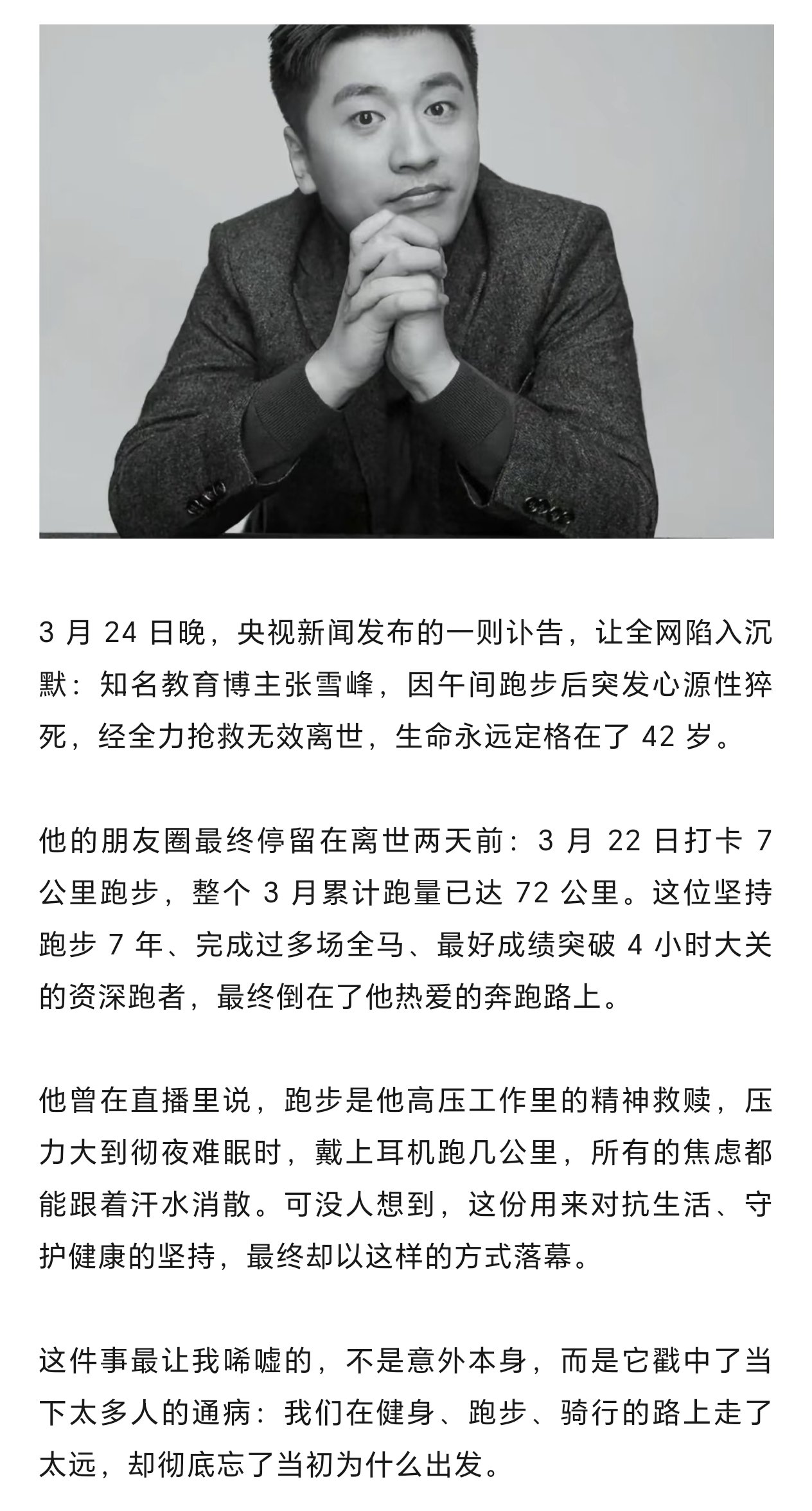 42 歲的張雪峯,用一場猝不及防的告別,給所有沉迷運動內卷的人敲響了警鐘。