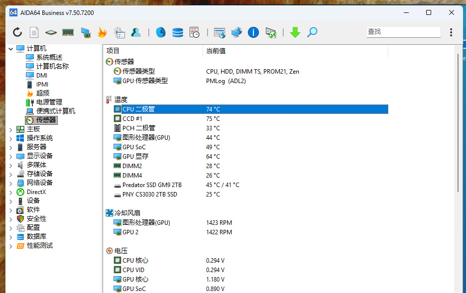CPU和显卡双烤下(关闭AVX512),即使散热吸了显卡的尾气,CPU温度也还不错是74°C: