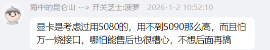于是建议老哥干脆冲5090D,琢磨下也同意了。后来他说明了担忧——怕遇见网上烧接口的事...