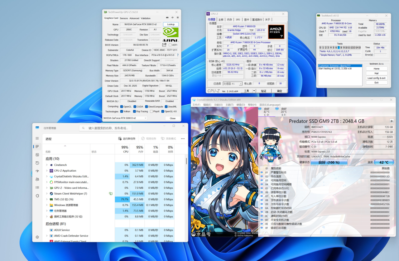 CPU是常客R7 9800X3D,这颗U的性能大家应该都知道了,就不废话了···