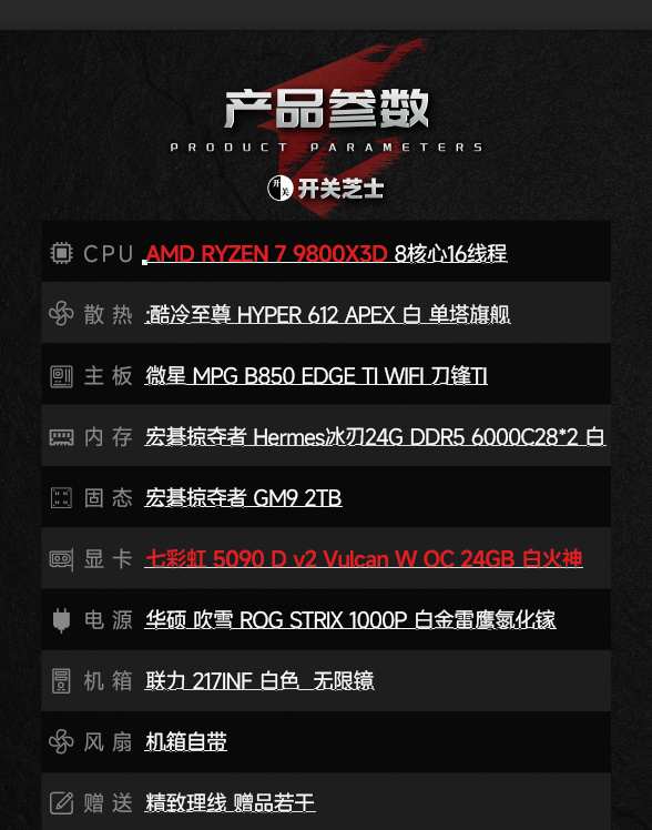 显卡则选择的七彩虹——5090D V2白火神,颜值拉满,2x6+7x8豪华热管,配备VC均热板: