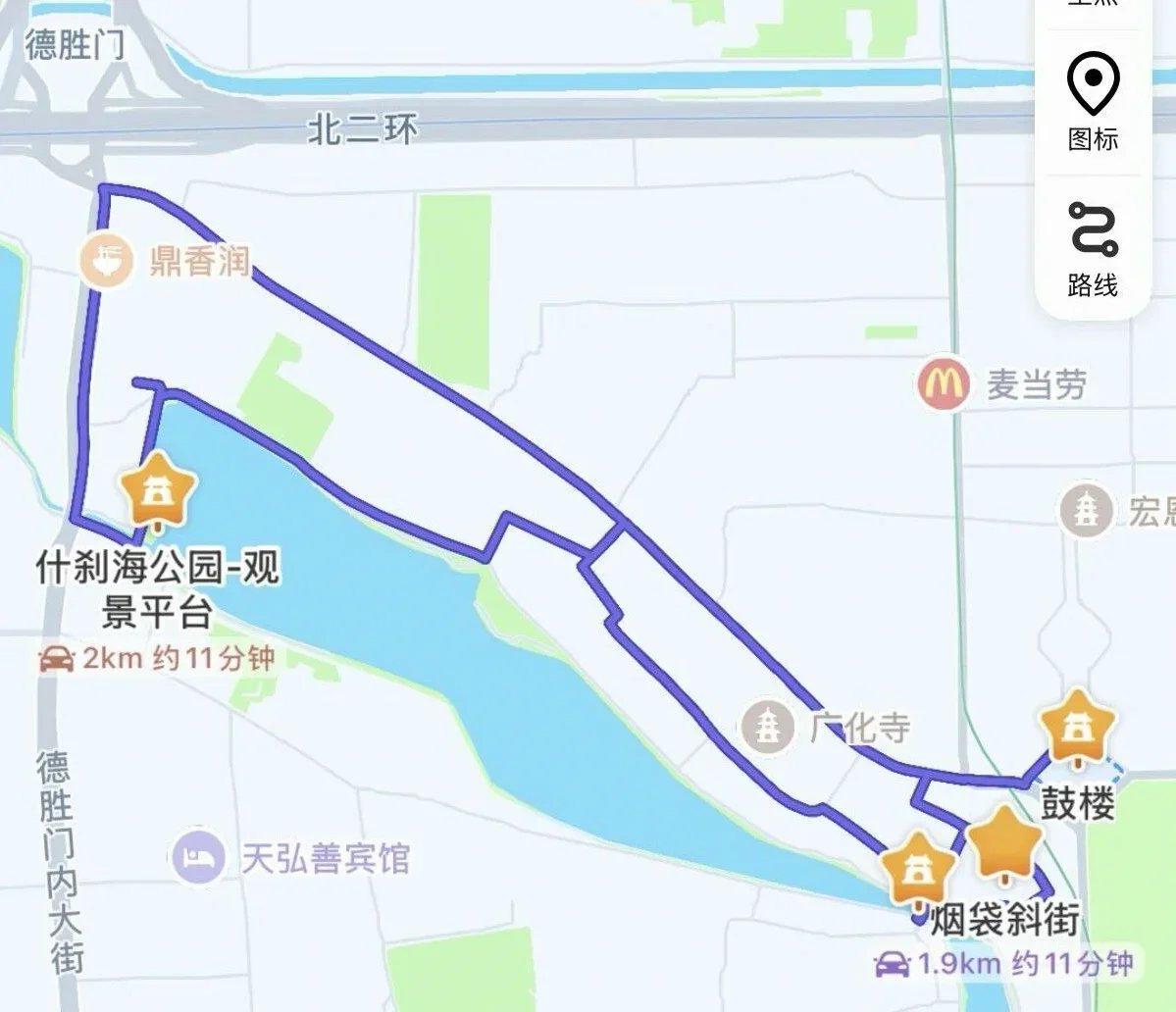⚠ 注意事项:什刹海酒吧街晚上有很多拉客的,喜欢安静的可沿西岸走;湖边小吃摊价格偏高,建议使用大众点评或者高德地图扫街榜查看本地必吃榜。