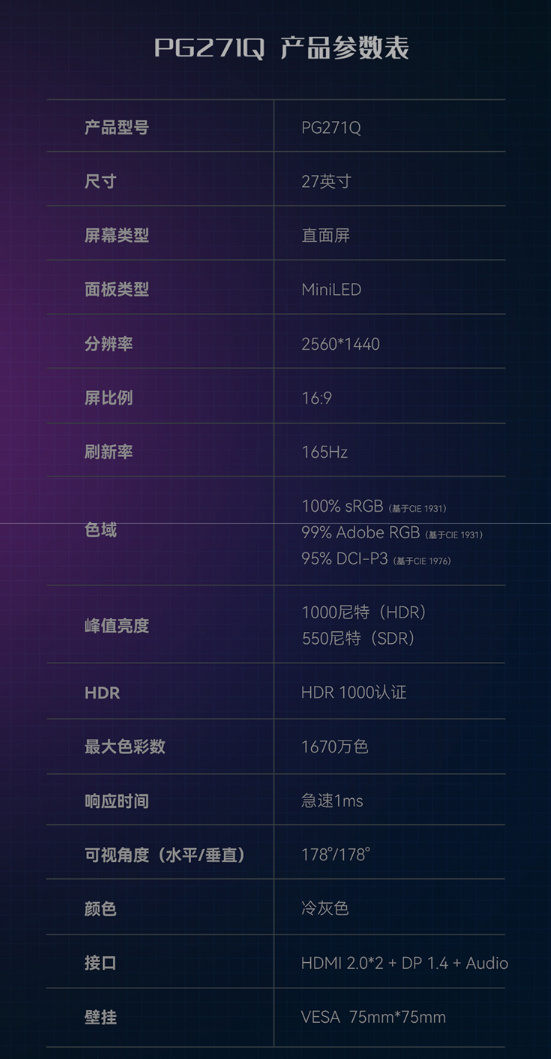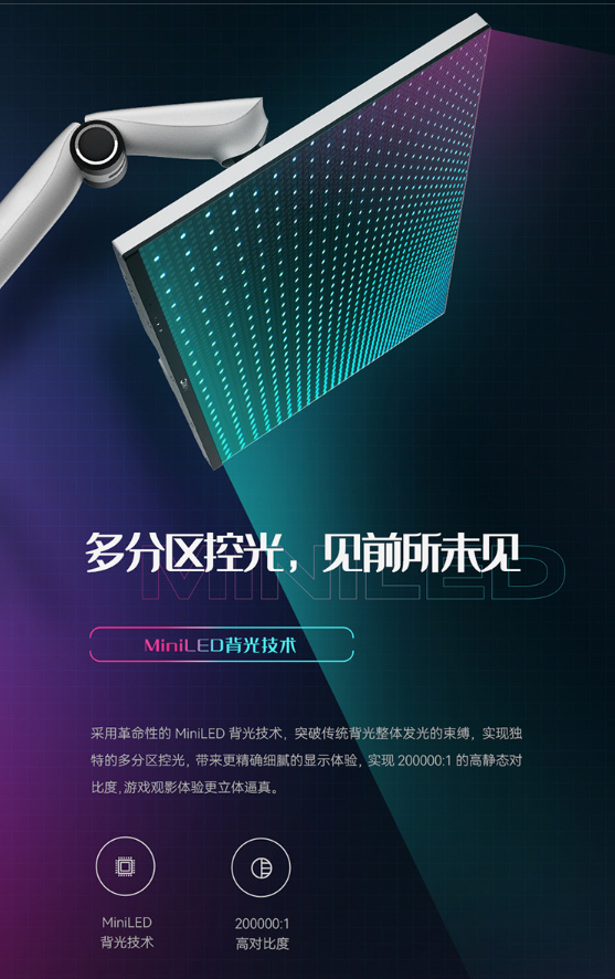 有几个比较值得关注的地方:MiniLED面板、99.9%sRGB 99.9%AdobeRGB 95.7%DCI-P3的色域、1000尼特峰值亮度、165Hz、分区背光。。