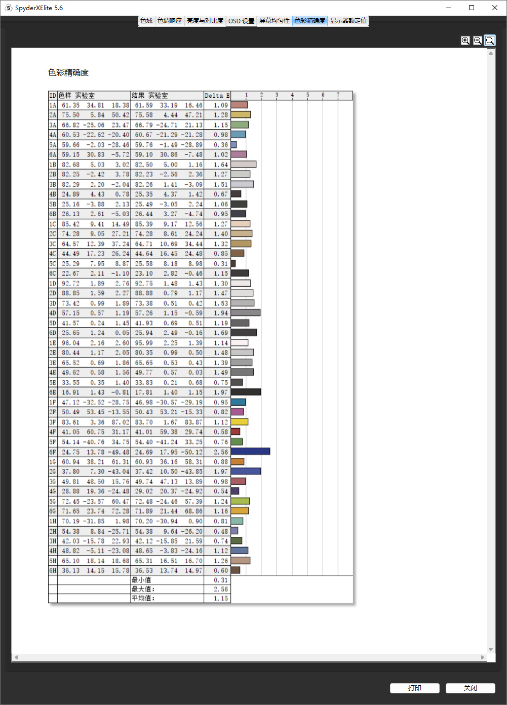色彩精度方面,ΔE=1.15,色彩精度表现也不错。