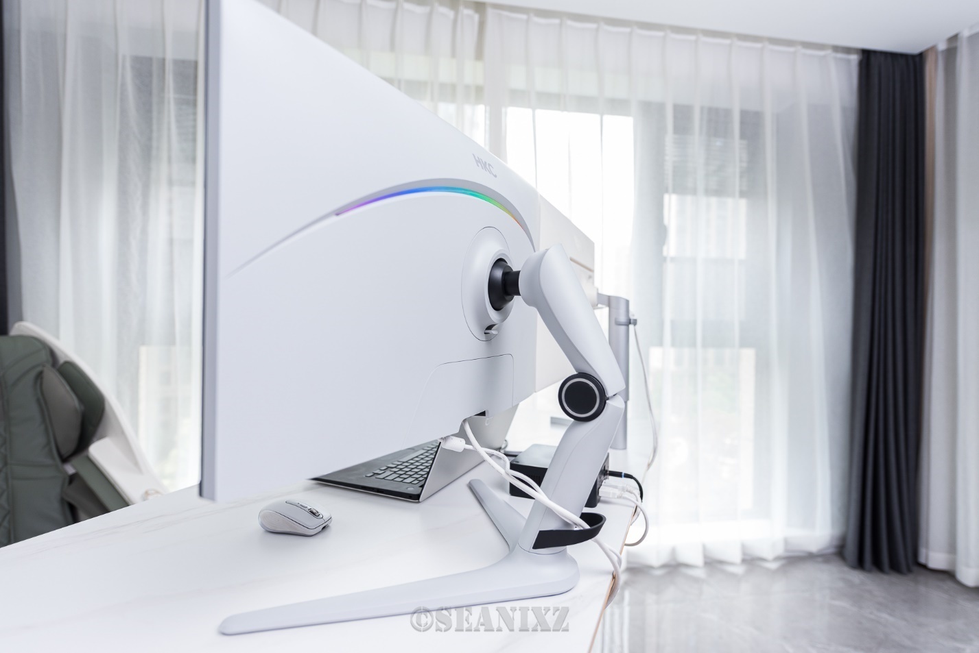 背部还有一个氛围灯设计,半月刀刃式的外形增加了竞技感,支持RGB光效,不过不支持与其他光效设备同步,这点有些遗憾。