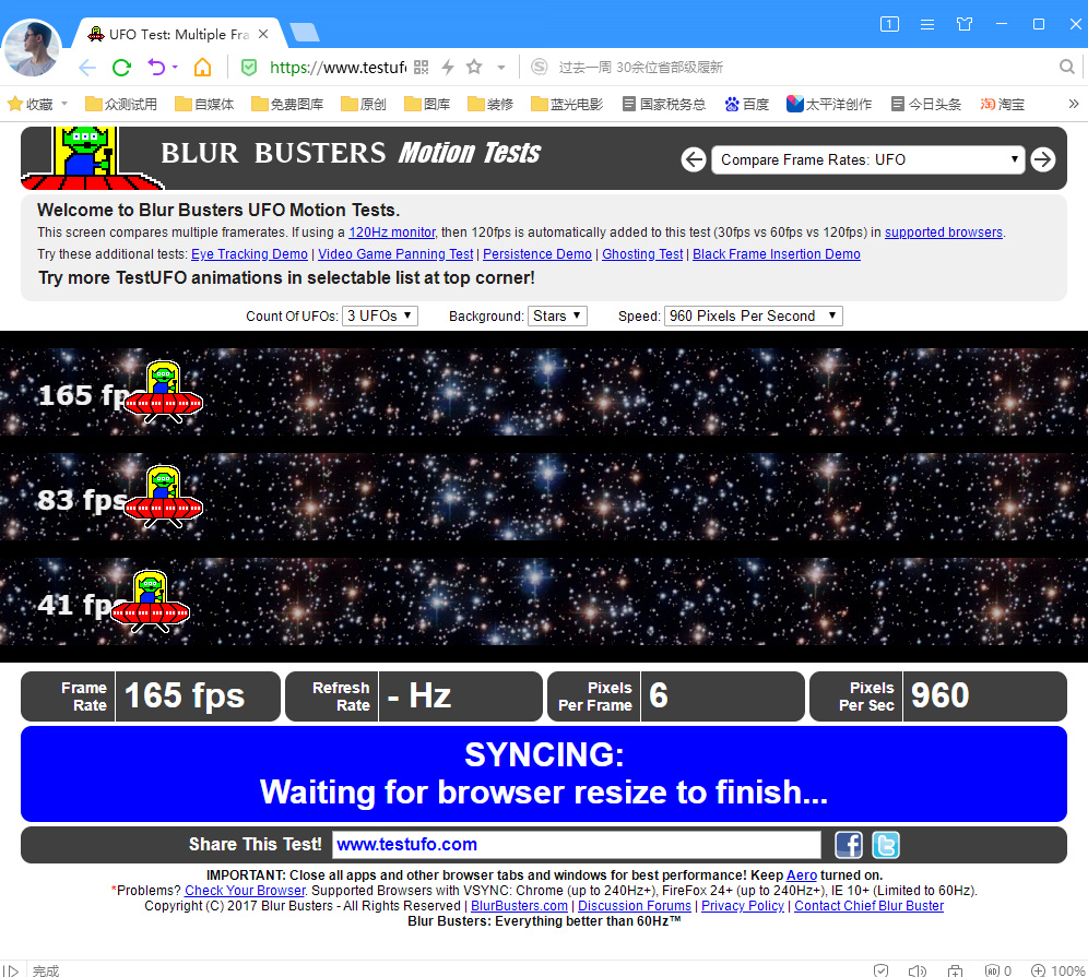 刷新率使用UFOtest测试,165fps无误。