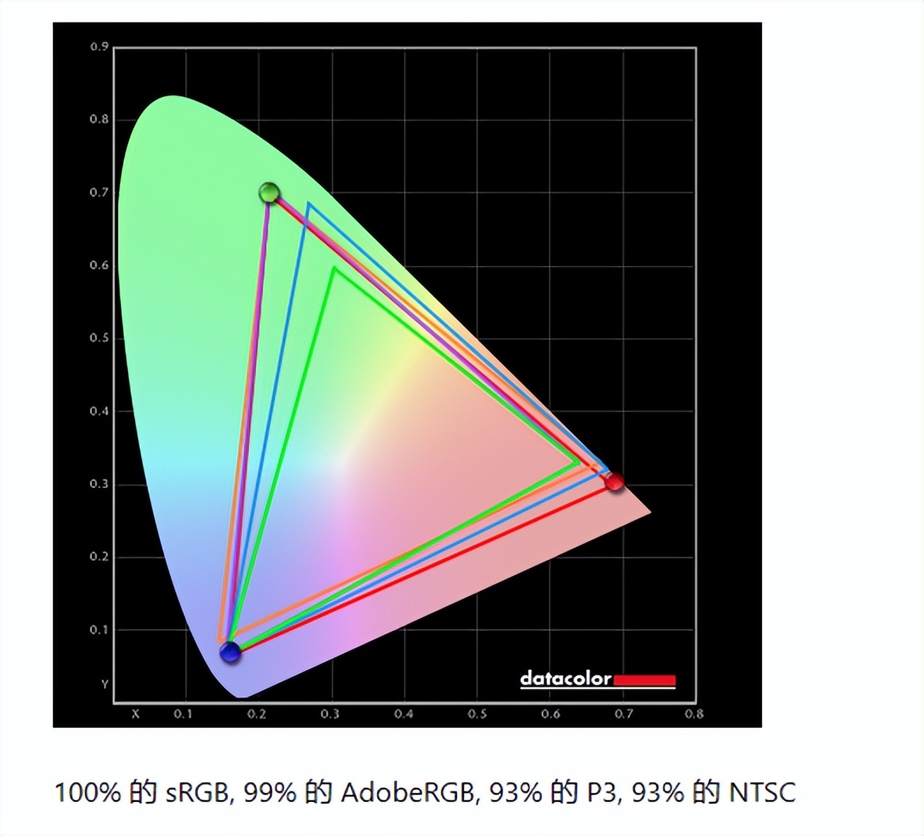色域测试结果如图,100%的sRGB,99%的AdobeRGB,93%的P3,93%的NTSC,99%的AdobeRGB意味着这已经是一块专业级的设计屏了,要知道5年前的一块99%AdobeRGB色域的屏幕的价位在2-4万左右,不得不说科技升级就是不断地让高端技术顶尖设备平民化。