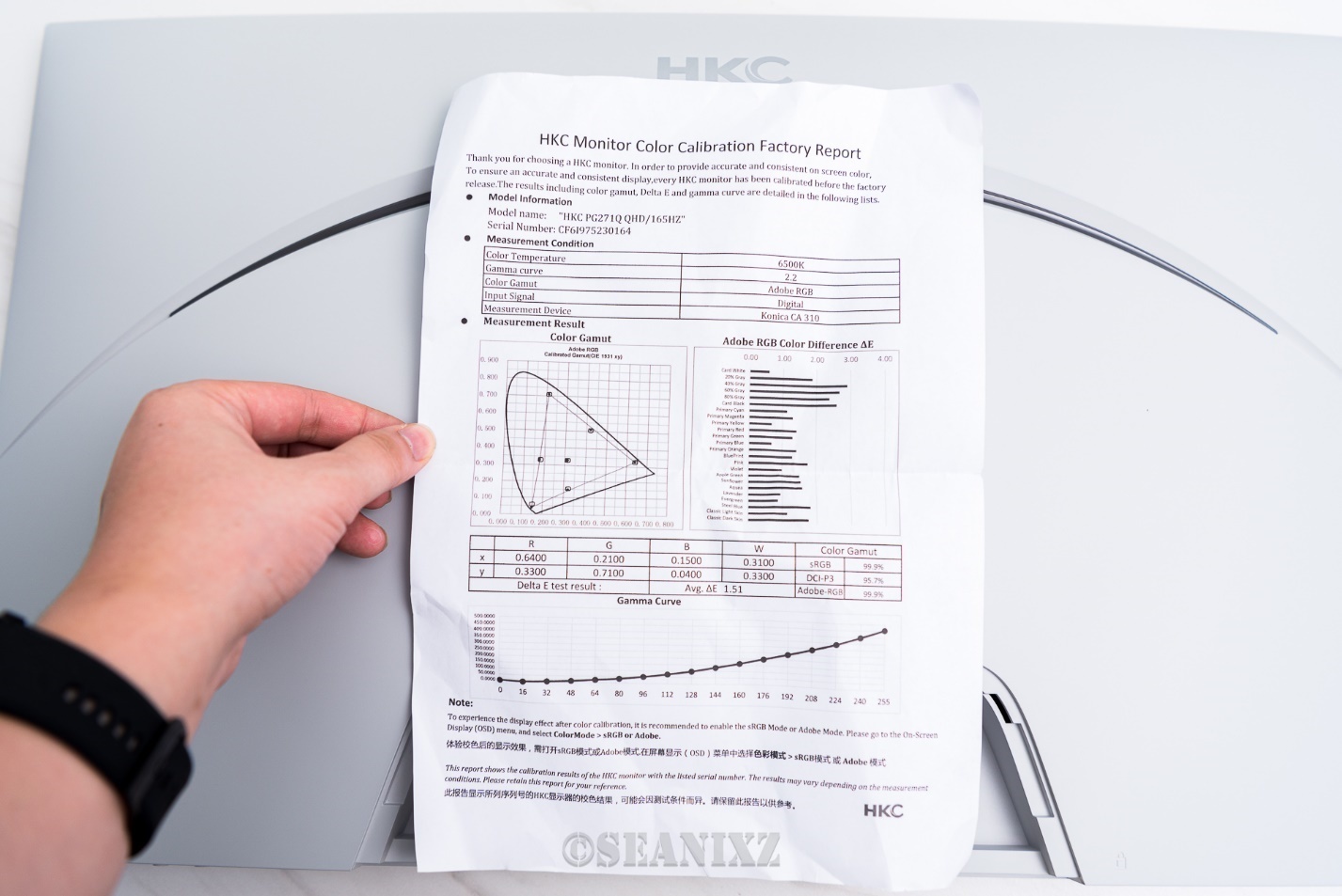 这箱内的张屏幕检测单展示了色彩方面的专业度,可以看到99.9%sRGB 99.9%AdobeRGB 95.7%DCI-P3的色域参数,非常专业的色彩表现。