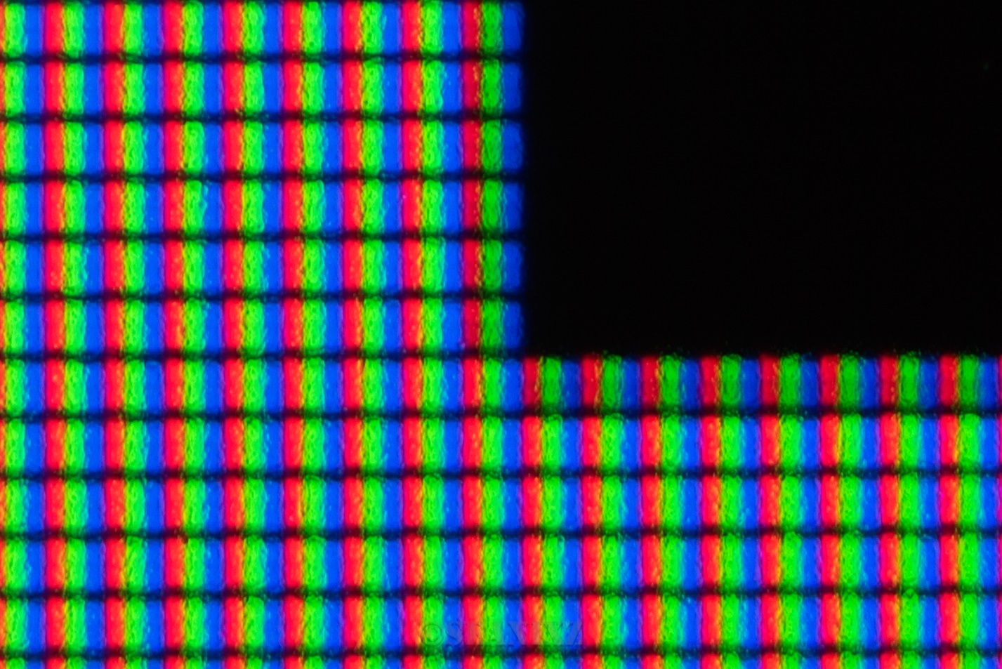 采用的标准RGB像素点排列,可以看到规规整整的RGB三色点,而且黑区黑得十分彻底,没有漏光现象,这是miniLED面板可以关闭背光光源的分区背光带来的效果,对比度更高。