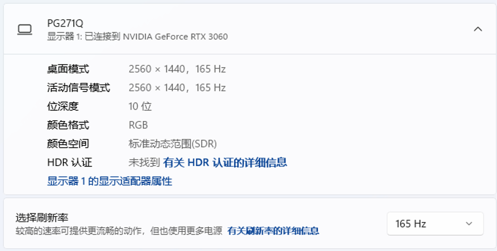 连接RTX3060显卡,分辨率2560×1440,刷新率165Hz,开启10bit位深。