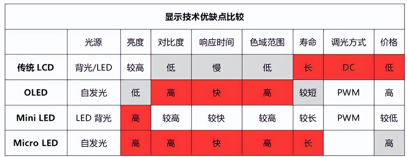 对比传统面板,MiniLED的优势是亮度高、对比度高、色彩高、寿命长,当然还有更强的MicroLED,其实也是MiniLED背光区域进一步升级的高阶版本。