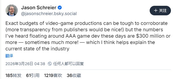 在推特上,彭博社記者Jason Schreier今天發文:目前一款3A遊戲的製作成本已經達到了3億美元甚至更高