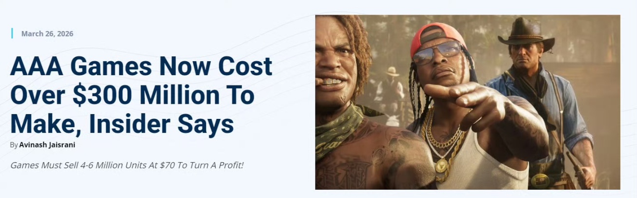 電子遊戲項目的確切預算往往難以覈實(如果發行商能更透明些就好了!),但我近來在3A遊戲開發圈聽到的數字是3億美元或更多——有時甚至遠多於此!——我想這有助於解釋行業當前的狀況。
