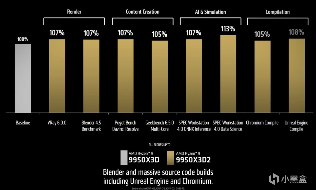 AMD 正在将 Ryzen 9 9950X3D2 定位到游戏之外,该处理器游戏性能可对标锐龙 7 9850X3D,同时在依赖大容量缓存数据集的生产力场景中(如软件开发、AI 训练与推理、视频制作),性能大幅提升。AMD 官方生产力基准测试显示,9950X3D2 相较 9950X3D 实现了显著的个位数百分比性能提升。