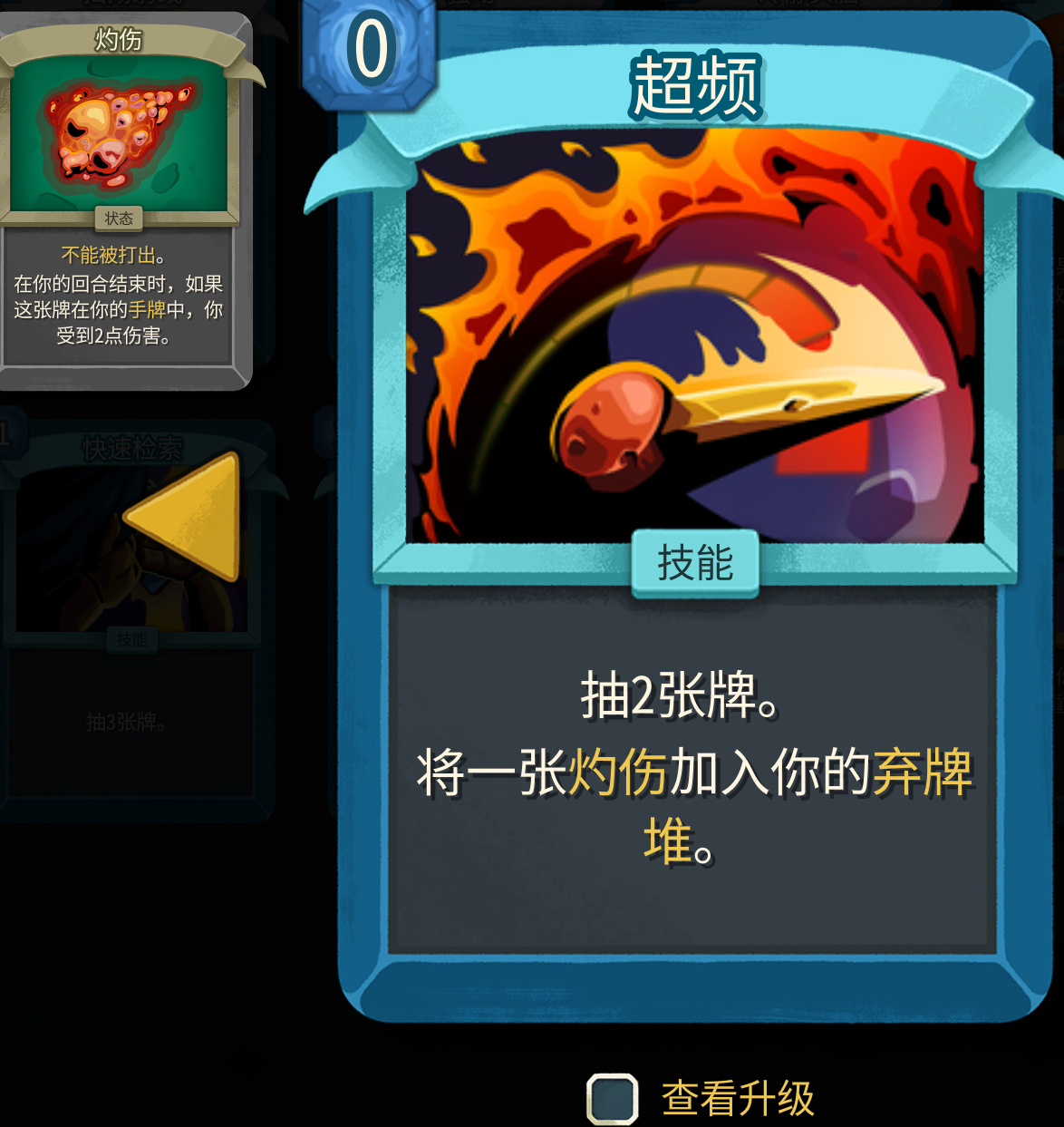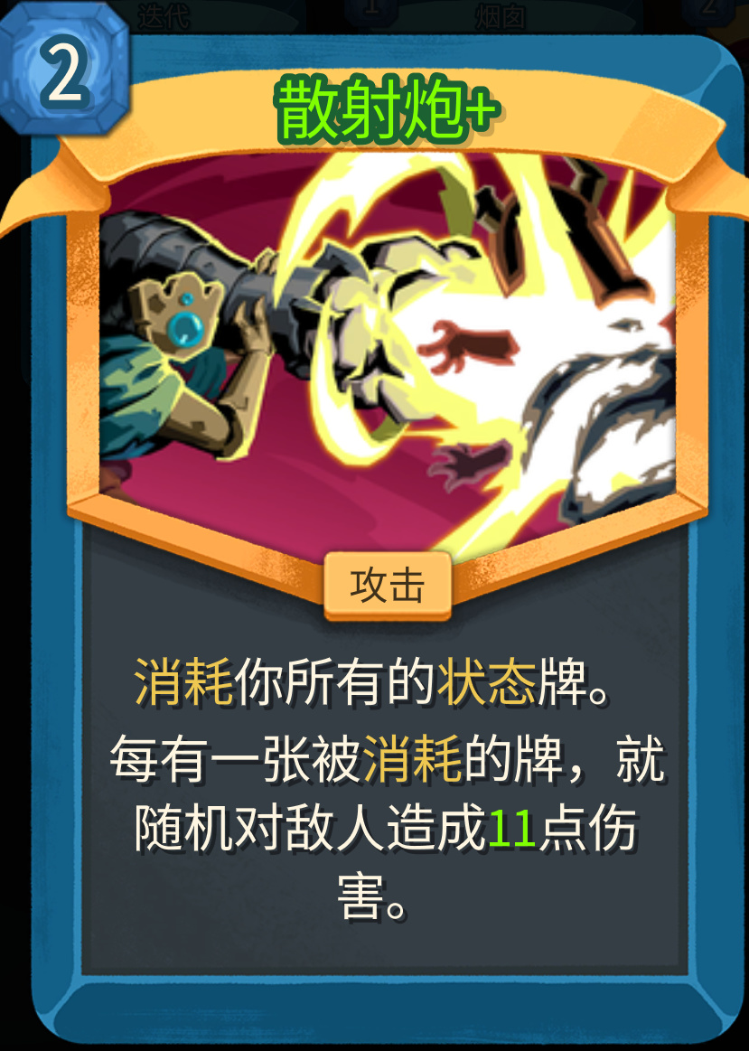 二代新加入的金卡,效果是消耗所有的状态牌,是的包括抽牌堆、弃牌堆和手牌,一次全清理。一张状态卡多一次效果触发,初始伤害是8点,升级之后变为11点。使用很灵活,可以作为输出终端,也可以当成一张定向清理+伤害补充卡,放心抓。