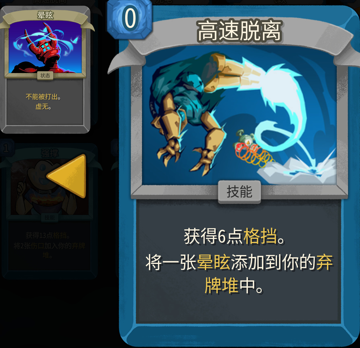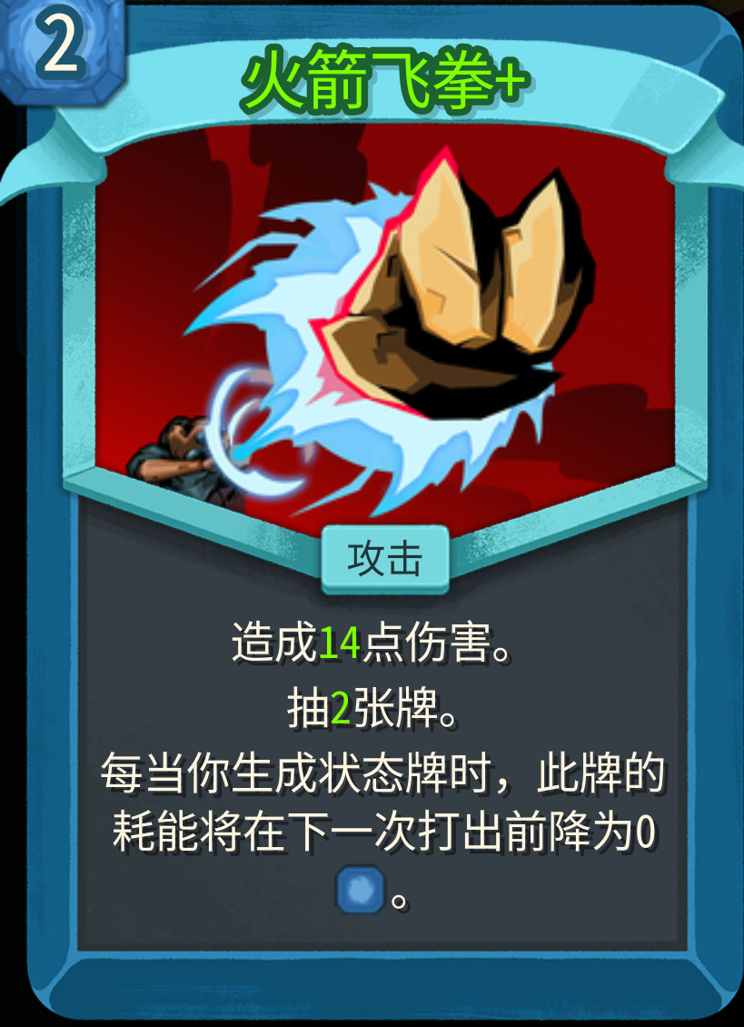 火箭飞拳是在生成状态之后可以免费打一次,造成13/14点伤害,抽1/2张牌,提供伤害的同时还补充了运转,在状态机体系里面抓取和升级优先级都很高。基本都是0费打14抽2,这个费用转化比放金卡都不为过啊。
