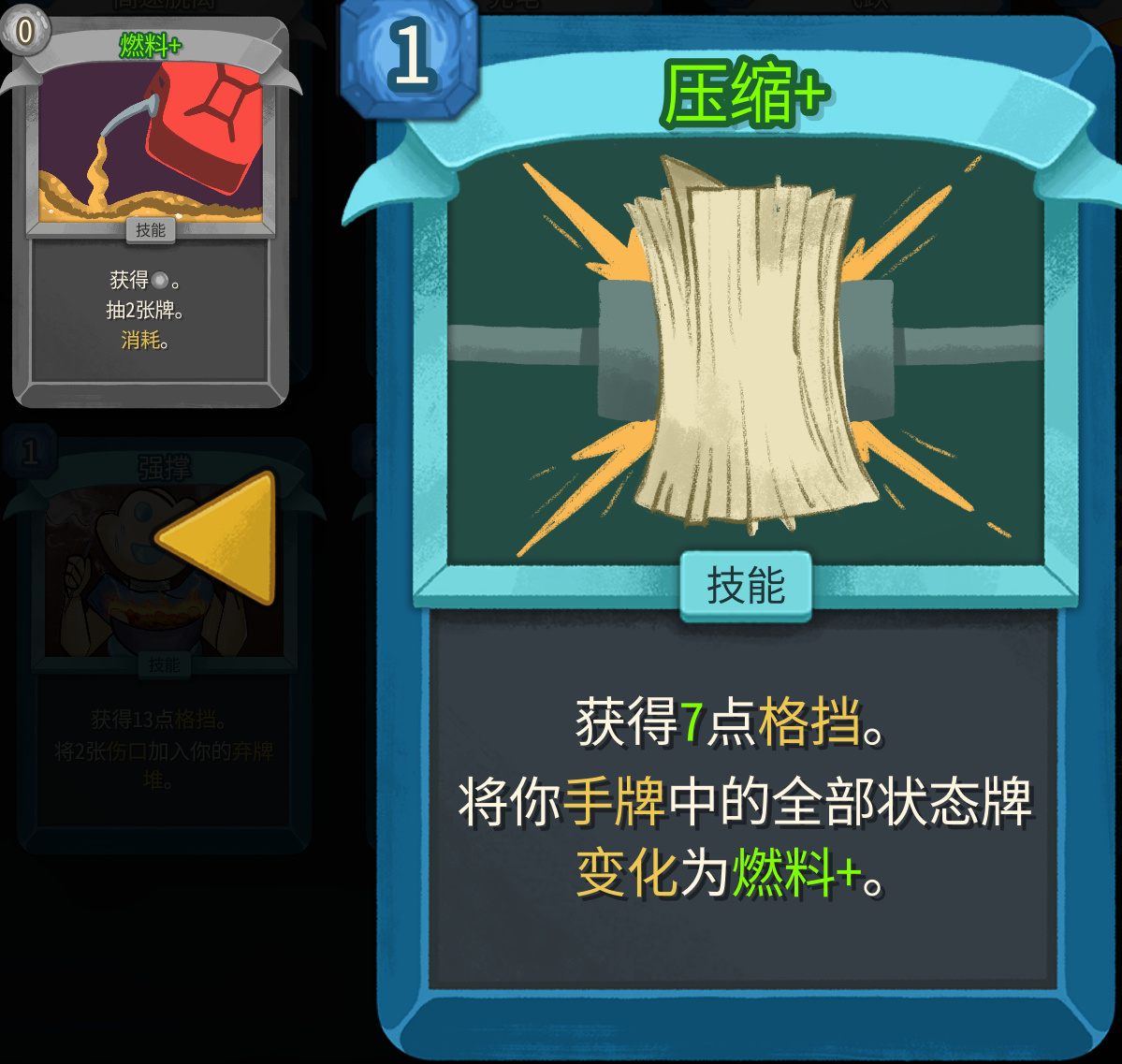 压缩在小二的体感里面是鸡煲的神卡,可以清理多余的状态牌,能够补能量和抽牌,还附赠6/7点格挡值。不只是状态机值得拿,其他体系都可以留一个卡位给压缩。