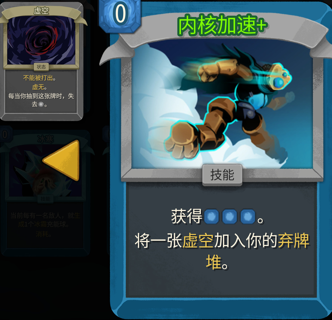 补充能量的卡都挺优质的,小二就放一块来了,超临界态、再利用、内核加速也都很给力。超临界态0费能够你补充6点能量,遇到可以无脑拿来补费。再利用能够压缩卡组还给你3点能量,消耗也能拿来清理状态牌,神卡无疑。