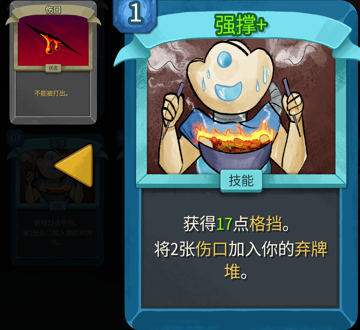 战士哥的卡给了我们鸡煲,一费获得大量格挡,还能生成两张伤口状态卡,一张卡可以撑起状态机的防御端。从卡面设计来看应该是鸡煲在拿筷子吃火锅,总感觉说的是官方自己的经历呢?小二欢迎各位老哥来四川吃火锅。