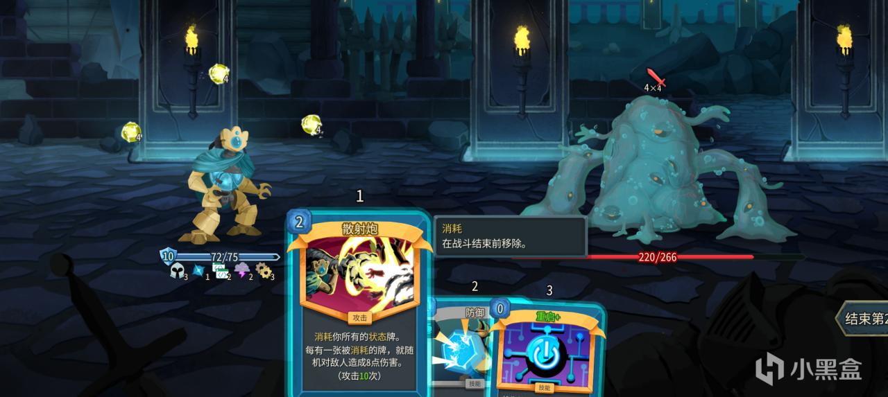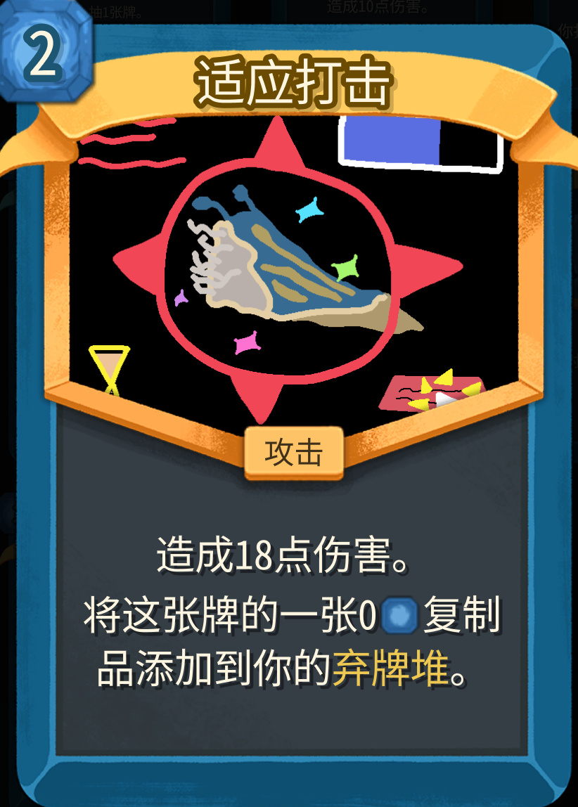 状态机的运转能力很强,适应打击这张单卡有非常不错的基础伤害面板,即使没拿到散射炮这些体系强相关单卡,我们也可以通过大量的0费适应打击,打爆首领的头。