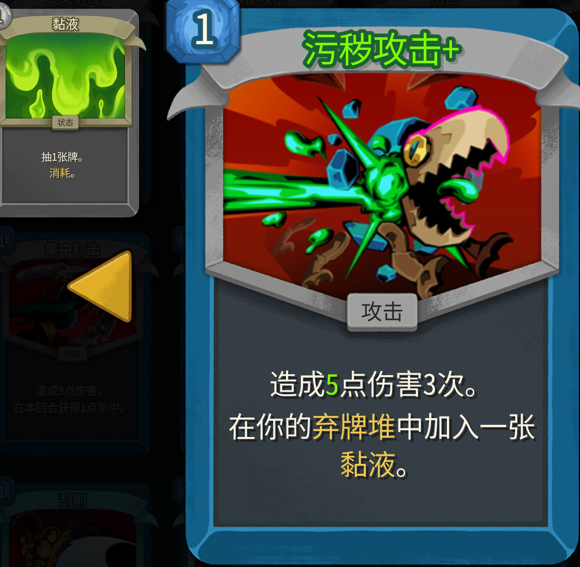 污秽攻击是白卡,前面很容易拿到,多段伤害可以配合光速射线使用,生成的粘液是放弃牌堆,也不会卡第一轮的启动,是一张不错的过渡卡。