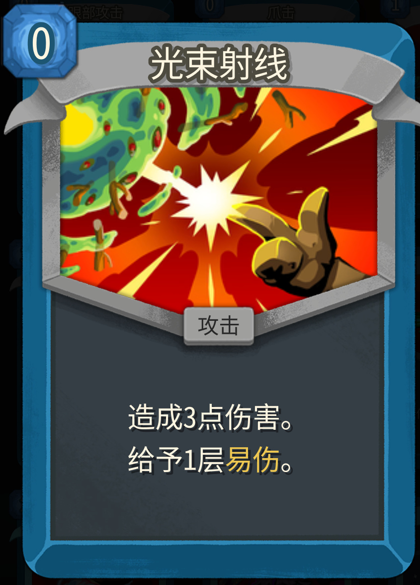 状态机输出多为攻击卡,光速射线的易伤可以放大我们的输出能力,常见的上限配合就是散射炮/污秽攻击。不过这张卡比较吃敲,需要给一个敲位升级成2层易伤。