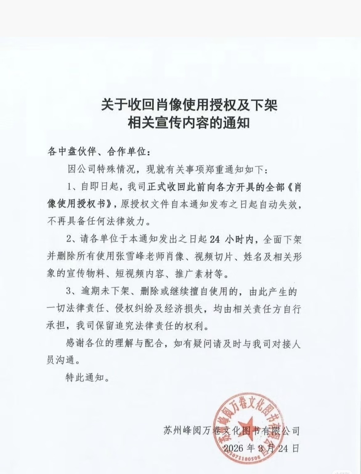 2、請各單位於本通知發出之日起24小時內,全面下架並刪除所有使用張雪峯老師肖像、視頻切片、姓名及相關形象的宣傳物料、短視頻內容、推廣素材等。
