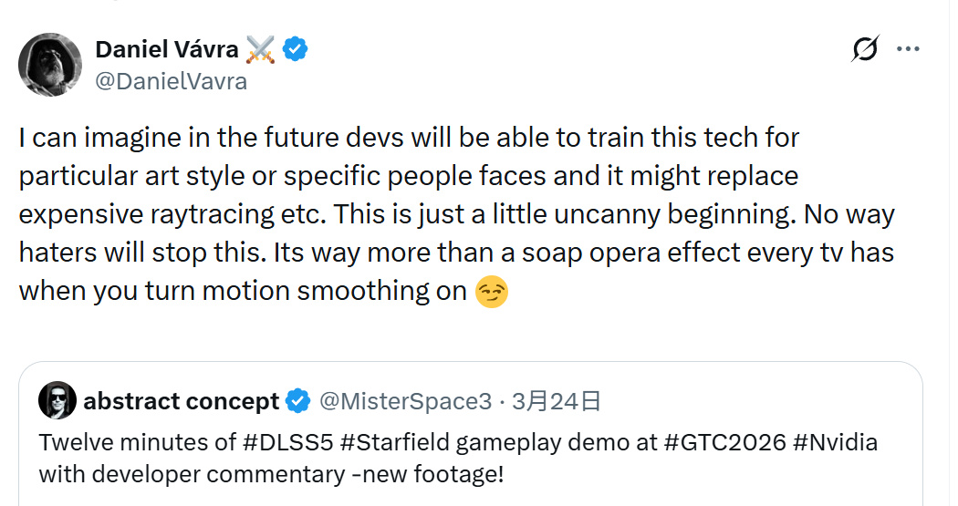 在英伟达DLSS 5技术于GTC 2026发布后引发的广泛争议中,游戏行业资深开发者、Warhorse Studios创始人兼创意总监丹尼尔·瓦夫拉(代表作《天国:拯救》系列、《黑手党》初代与二代)发表了明确的支持意见。
