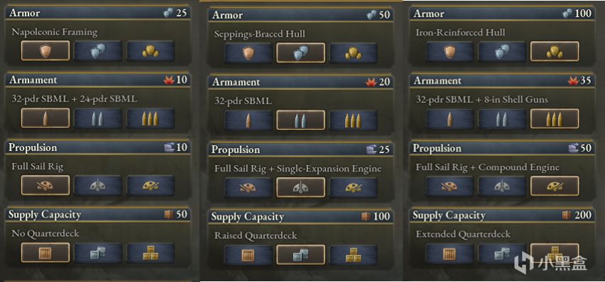 整体而言,所有类型的船舰都会因为其数值的提高而要求更高的建造(与维护)成本。降低一些数值能够让船检更便宜。因此,你需要根据你的国家的情况做出选择,数值还是成本、装甲还是速度、伤害还是补给?
