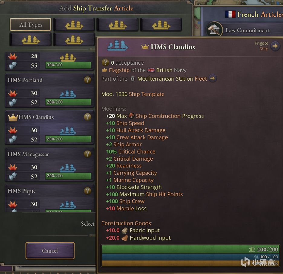 全新的舰船转让条款的使用方法与其他条款一样,所有的船舰都是可交易对象。编辑此条款时,展示你或对方国家全部船舰的列表将被打开。界面将拥有过滤器,以方便你从皇家海军中找到克劳狄乌斯号。