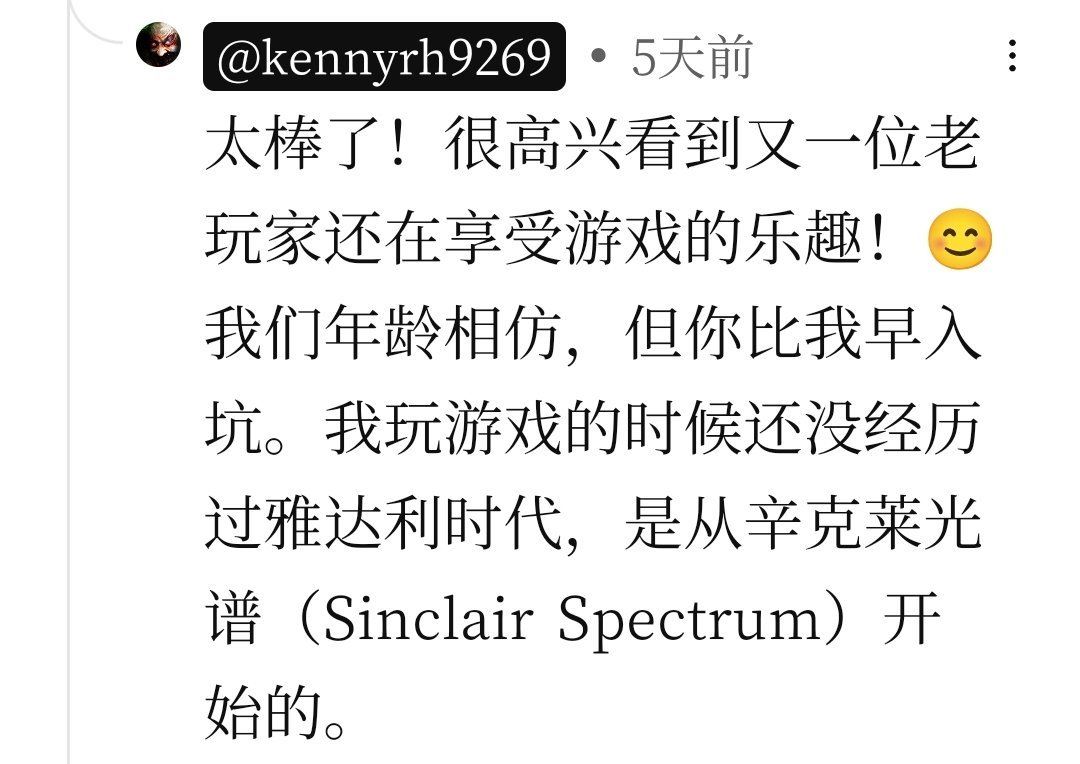 还有另一个大龄网友表示:很高兴看到另一位“资深”玩家。我今年78岁,从上世纪80年代就开始玩游戏了。作者回:太棒了!很高兴看到又一位老玩家还在享受游戏的乐趣!我们年龄相仿,但你比我早入坑。我玩游戏的时候还没经历过雅达利时代,是从辛克莱光谱开始的。