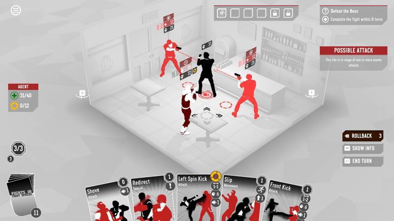场景:电梯间,四名敌人。两名打手占据对角,一名壮汉堵在出口,一名西装保镖在外围游走。你的手牌并不华丽:“扫堂腿”(使相邻敌人倒地)、“战术翻滚”(穿过敌人移动,不消耗能量)、“抓投”(控制倒地或眩晕的敌人)、“上勾拳”(伤害+击飞)。没有高伤大招,没有范围攻击,只有四张看起来效果很简单的普通卡牌。