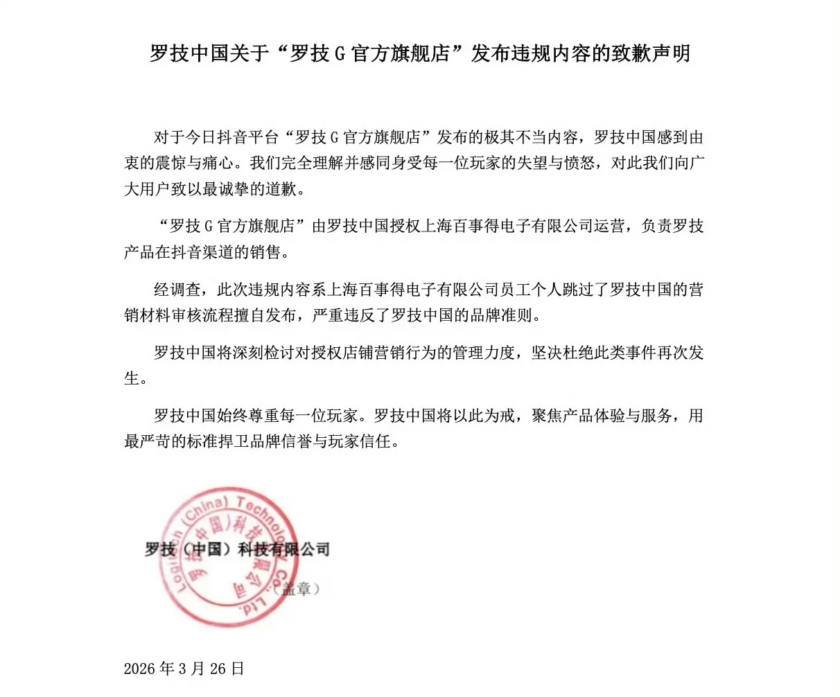 舆论发酵后,罗技中国深夜发布致歉声明,可这份声明不仅没平息怒火,反而让危机彻底升级,被网友痛批“最敷衍的甩锅式公关”