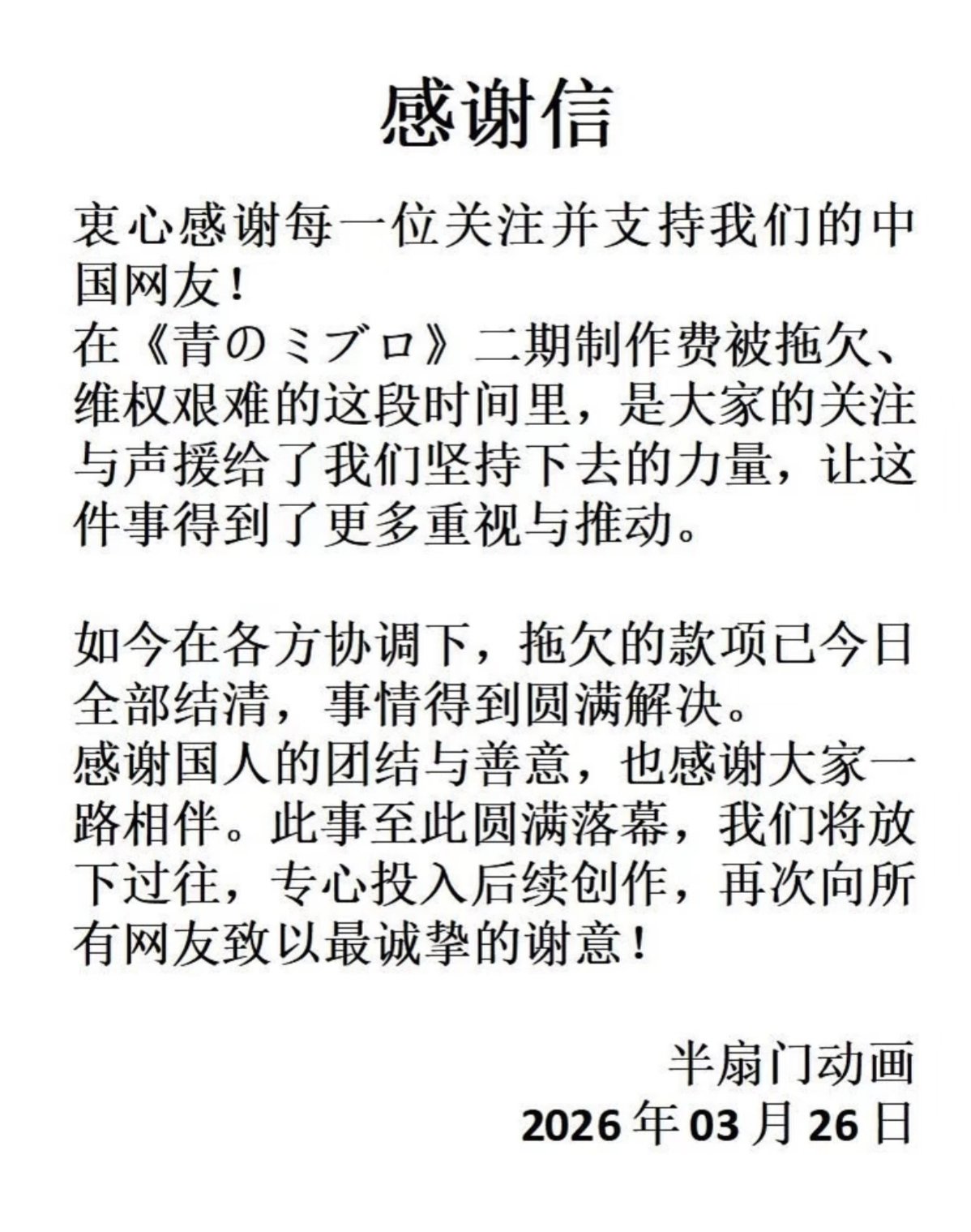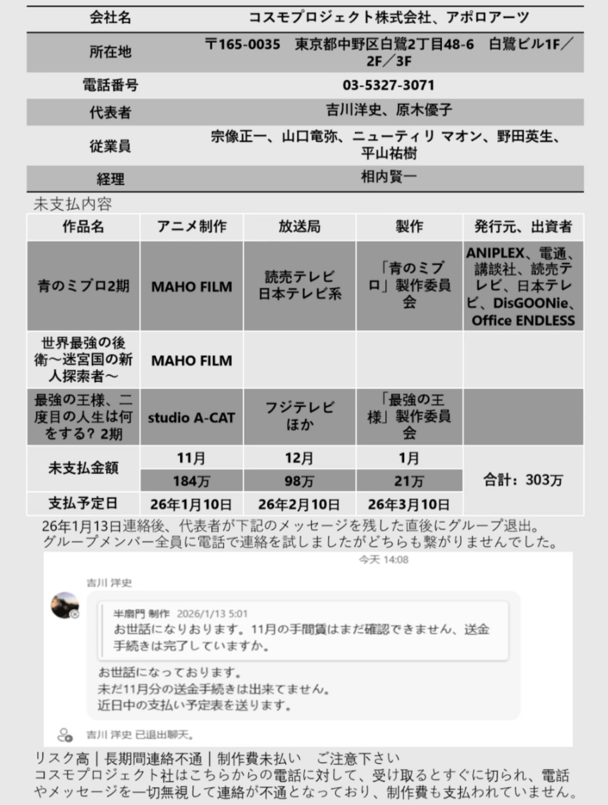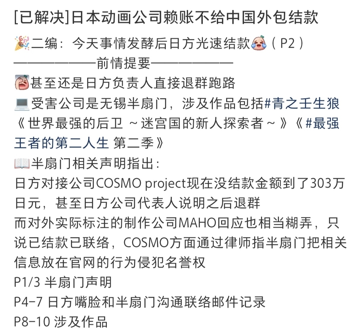 继之前P1S欠款160w后,日本动画公司COSMOproject被指控拖欠中国外包商无锡半扇门的动画制作费用,金额为303万日元(约合人民币14万元)